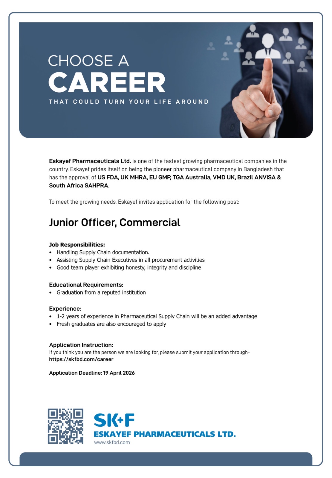 1 to 2 years experience in Pharmaceutical Supply Chain will be an added advantage. Fresh graduates are also encouraged to apply